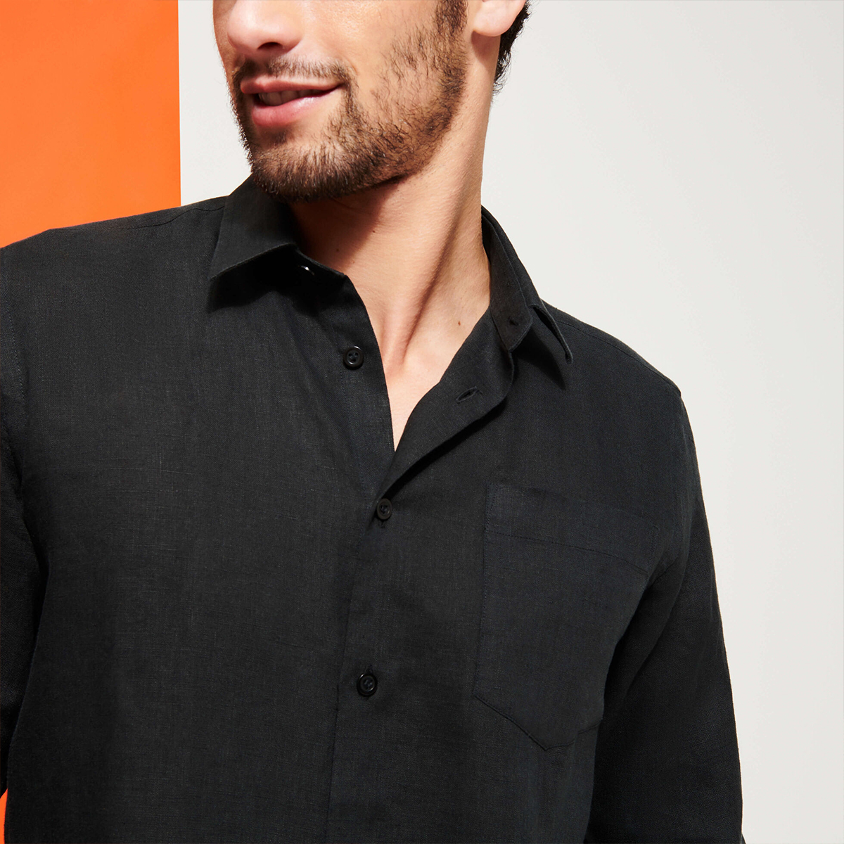 Uzun kollu keten gömlekler, Vilebrequin’in St Tropez’den ilham alan stilini klasik, sade bir kesimle gösteriyor. Yumuşak keten kumaştan yapılmış bu gömlek, eteğinde aynı tonda işlenmiş ikonik kaplumbağa logosu ile dikkat çekiyor.