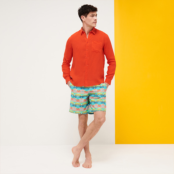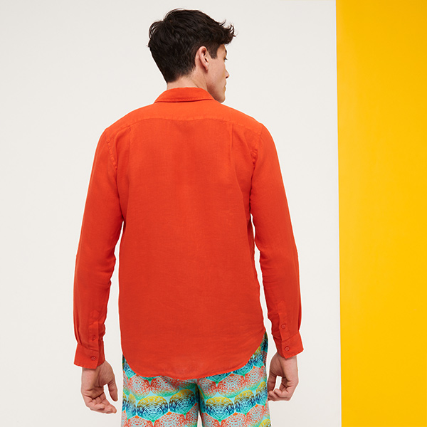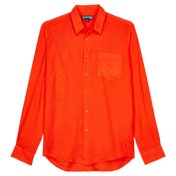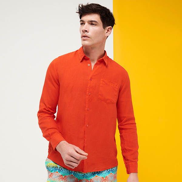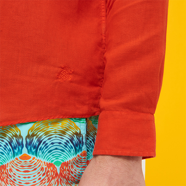 Caroubis uzun kollu keten gömlekler, Vilebrequin’in St Tropez’den ilham alan stilini klasik, sade bir kesimle gösteriyor. Yumuşak keten kumaştan yapılmış bu gömlek, eteğinde aynı tonda işlenmiş ikonik kaplumbağa logosu ile dikkat çekiyor.