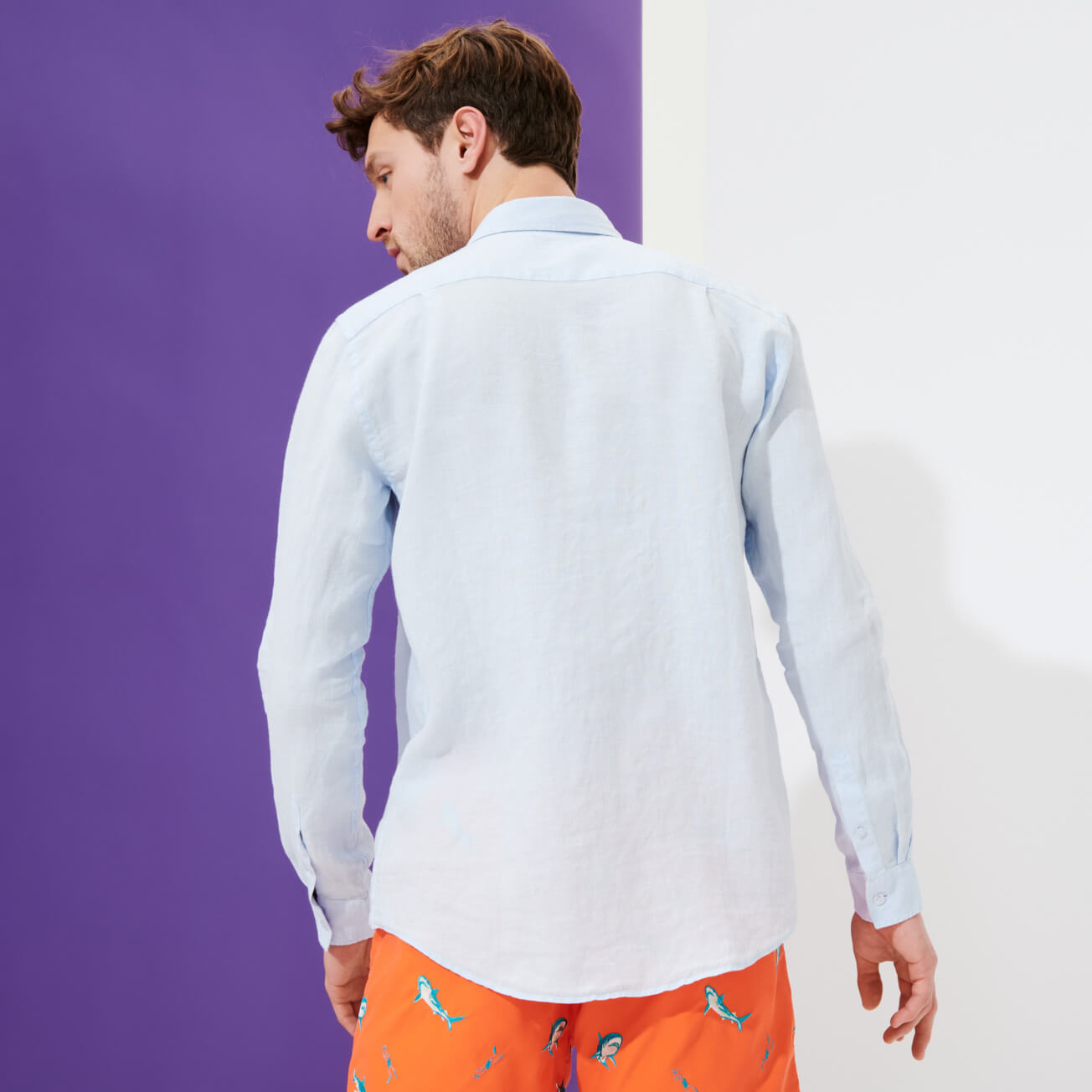 Caroubis uzun kollu keten gömlekler, Vilebrequin’in St Tropez’den ilham alan stilini klasik, sade bir kesimle gösteriyor. Yumuşak keten kumaştan yapılmış bu gömlek, eteğinde aynı tonda işlenmiş ikonik kaplumbağa logosu ile dikkat çekiyor.