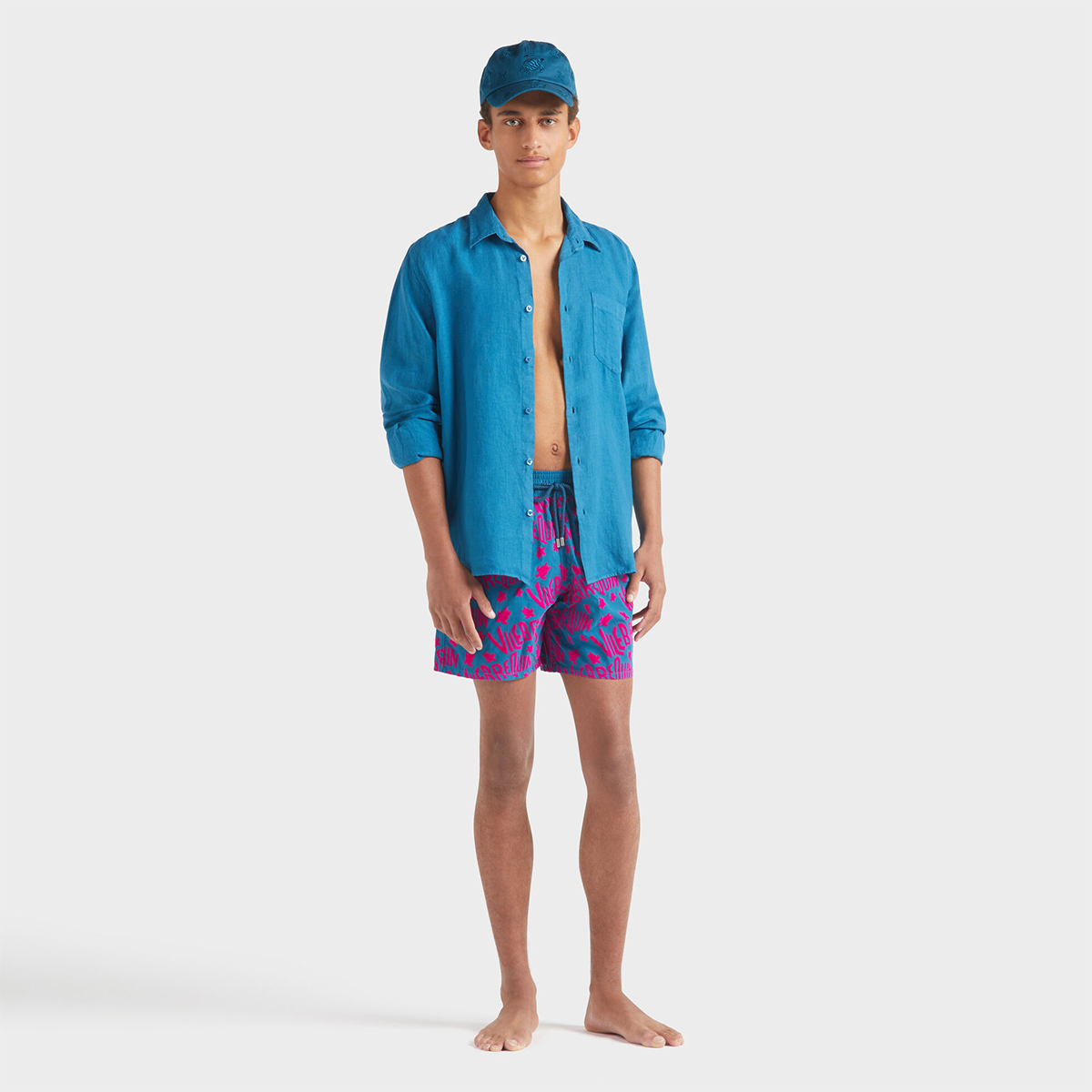 Caroubis uzun kollu keten gömlekler, Vilebrequin’in St Tropez’den ilham alan stilini klasik, sade bir kesimle gösteriyor. Yumuşak keten kumaştan yapılmış bu gömlek, eteğinde aynı tonda işlenmiş ikonik kaplumbağa logosu ile dikkat çekiyor.