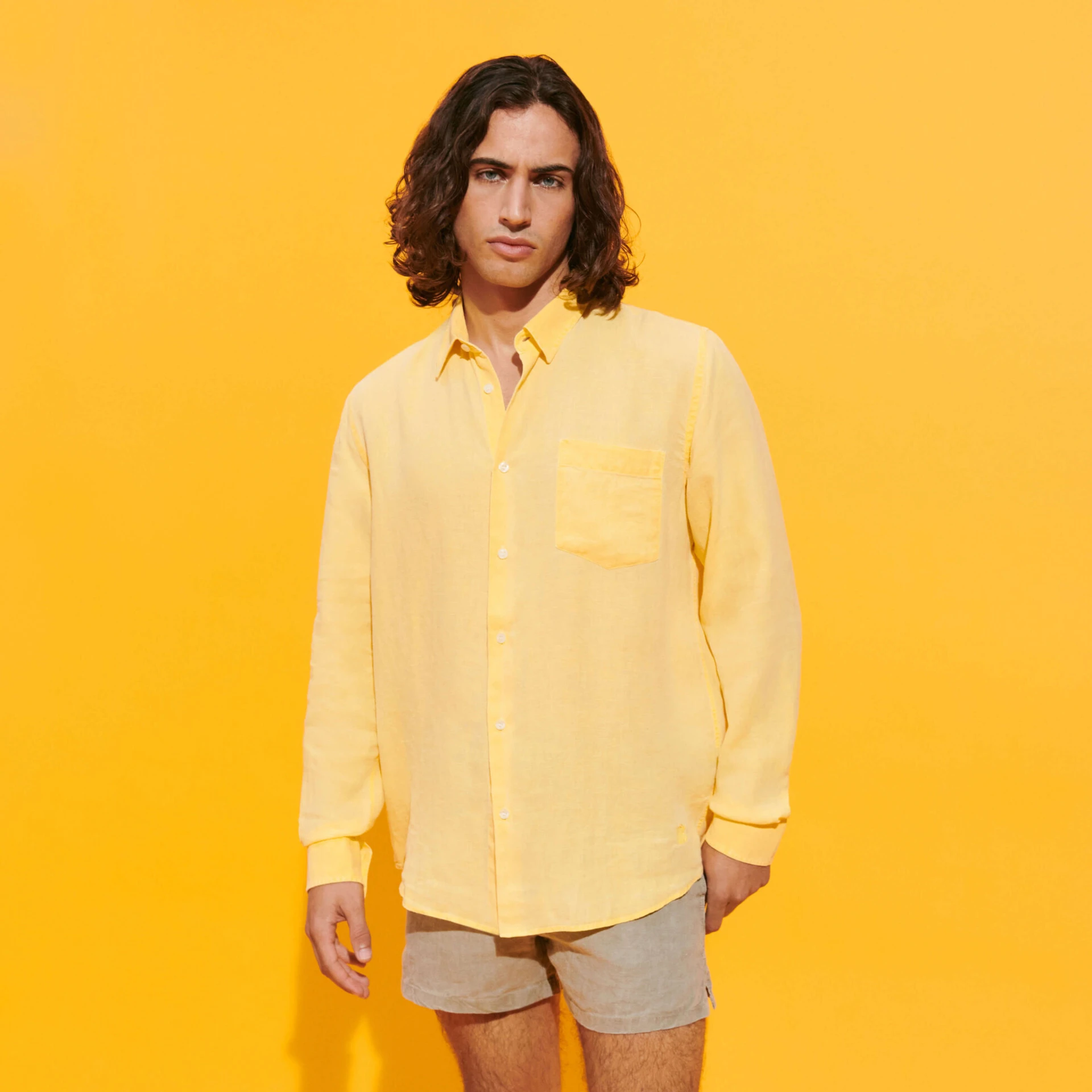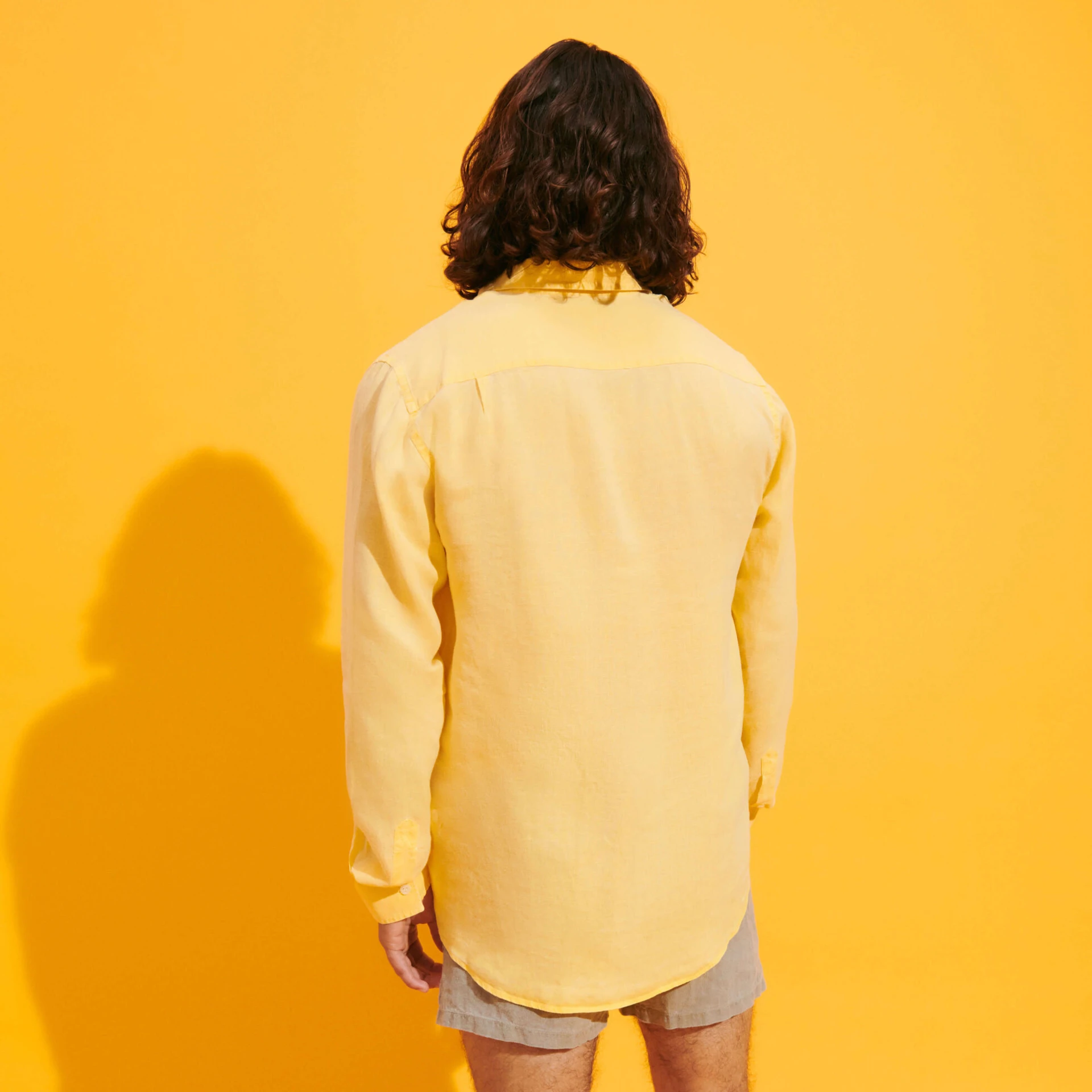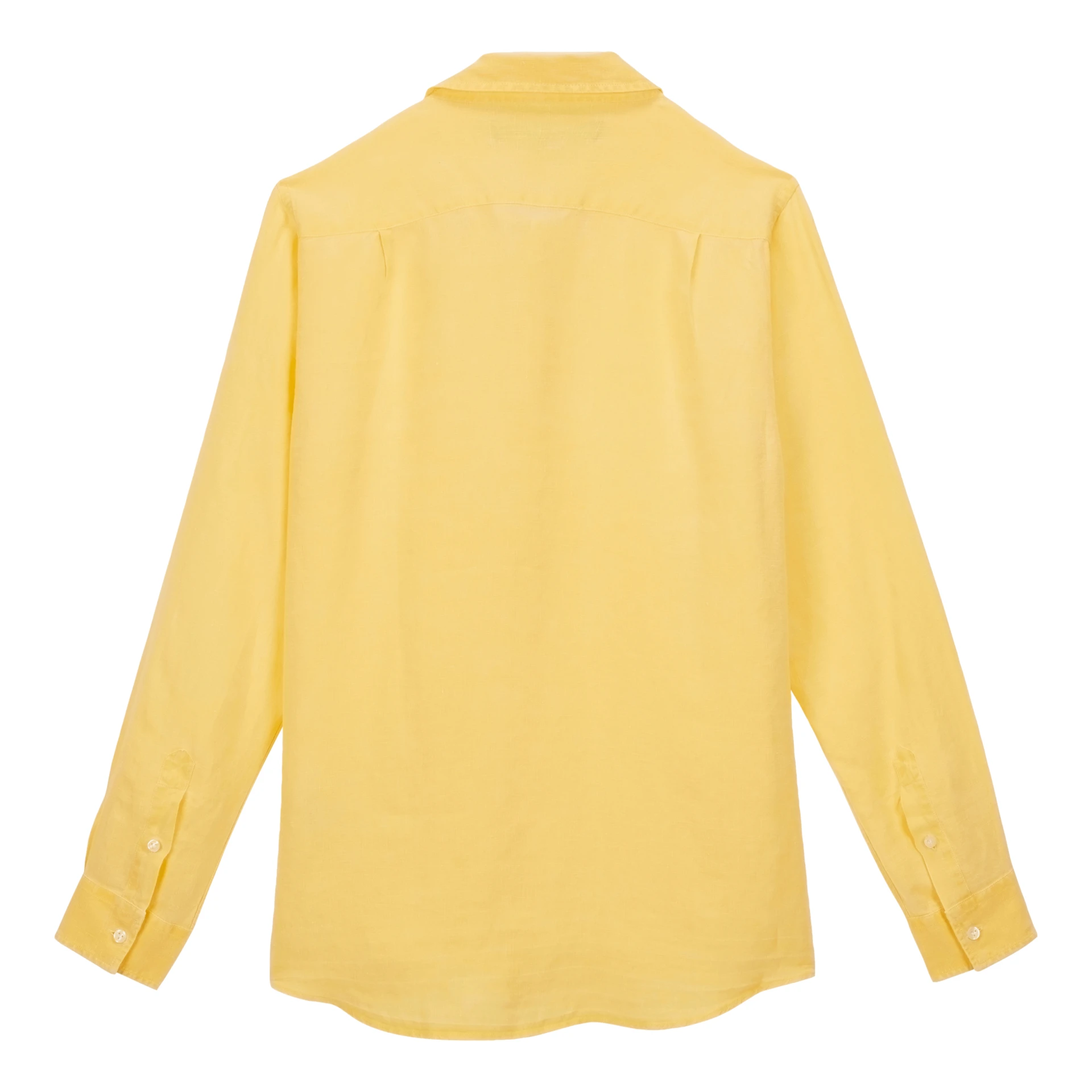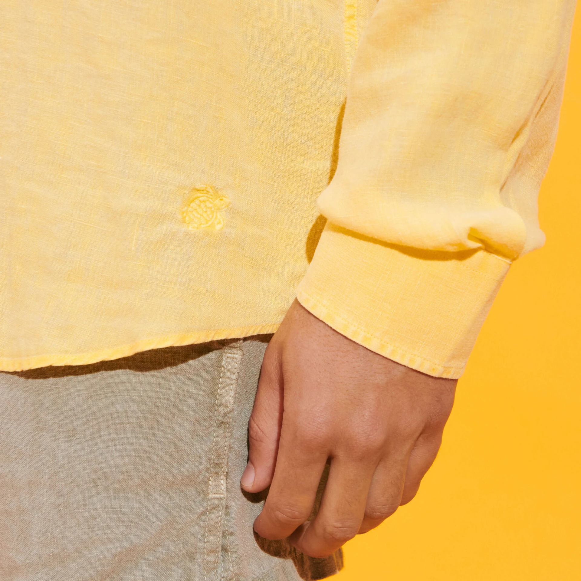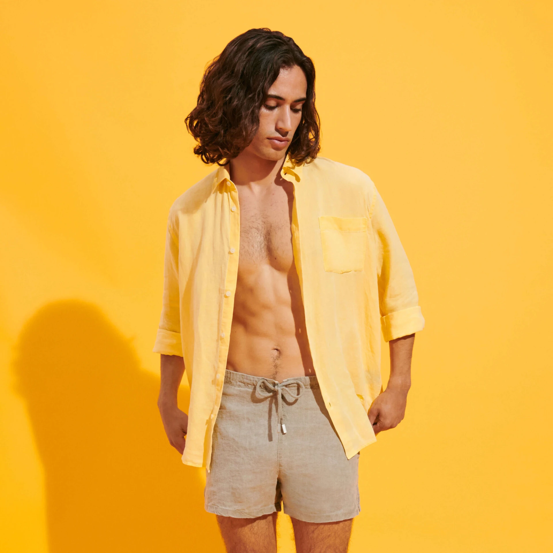 Caroubis uzun kollu keten gömlekler, Vilebrequin’in St Tropez’den ilham alan stilini klasik, sade bir kesimle gösteriyor. Yumuşak keten kumaştan yapılmış bu gömlek, eteğinde aynı tonda işlenmiş ikonik kaplumbağa logosu ile dikkat çekiyor.