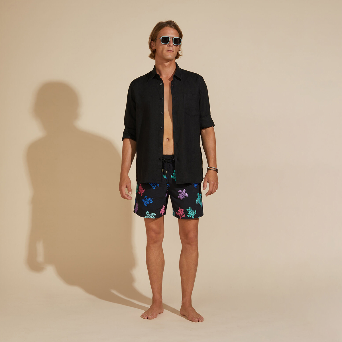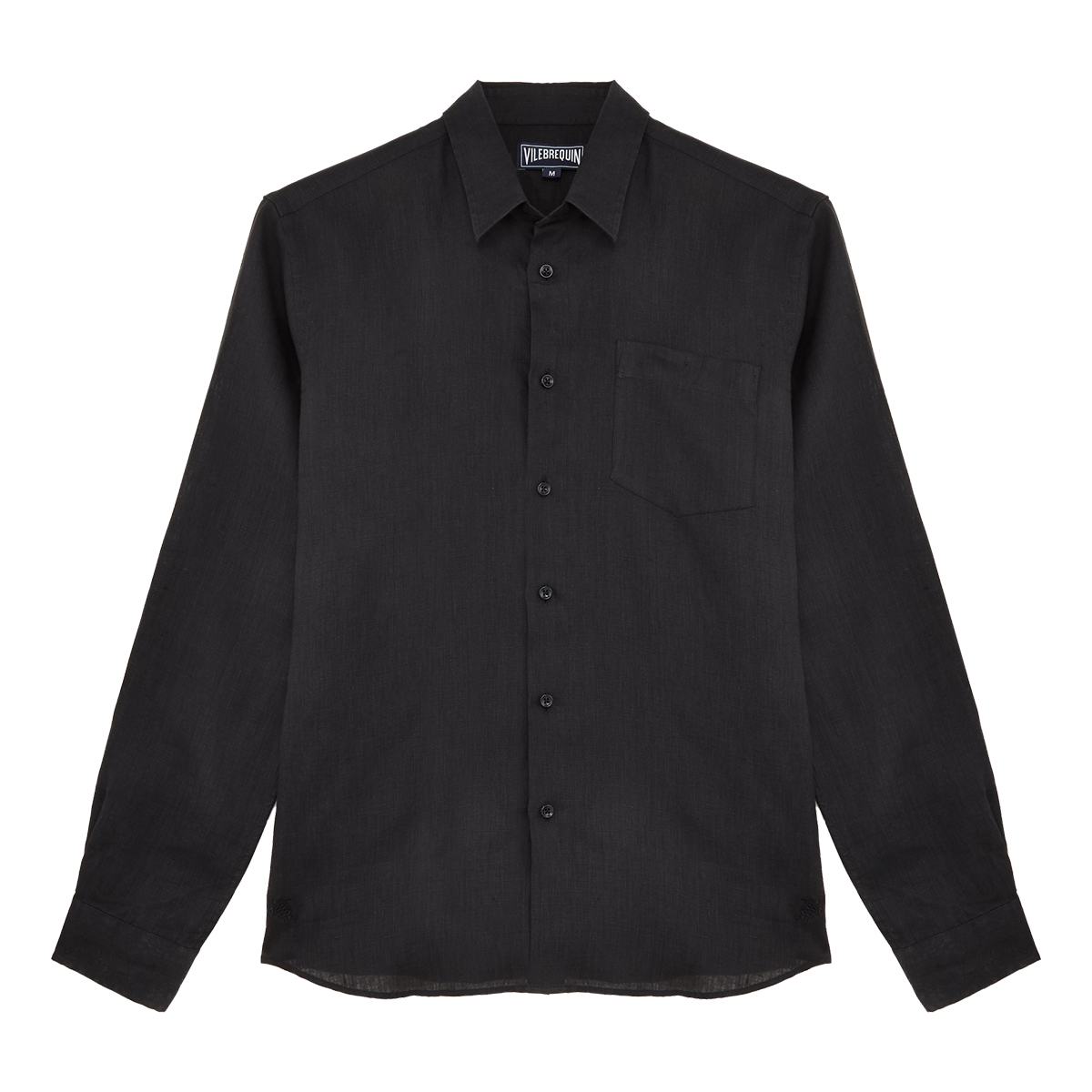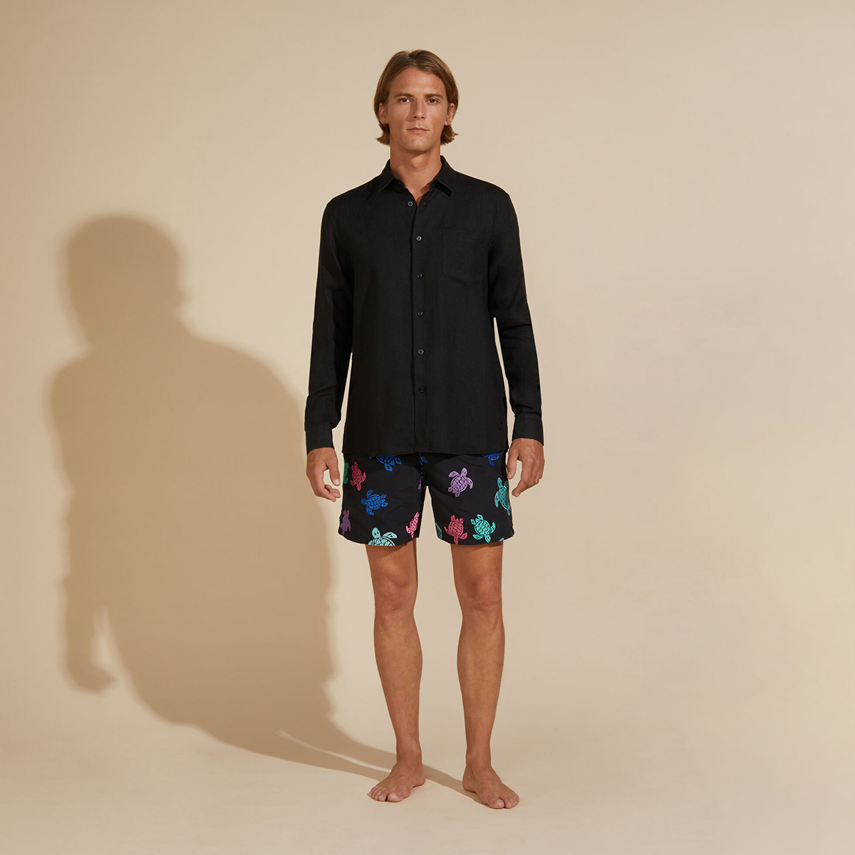 Caroubis uzun kollu keten gömlekler, Vilebrequin’in St Tropez’den ilham alan stilini klasik, sade bir kesimle gösteriyor. Yumuşak keten kumaştan yapılmış bu gömlek, eteğinde aynı tonda işlenmiş ikonik kaplumbağa logosu ile dikkat çekiyor.
