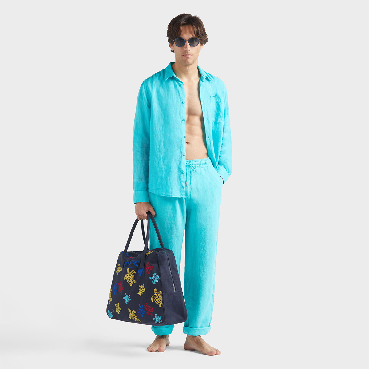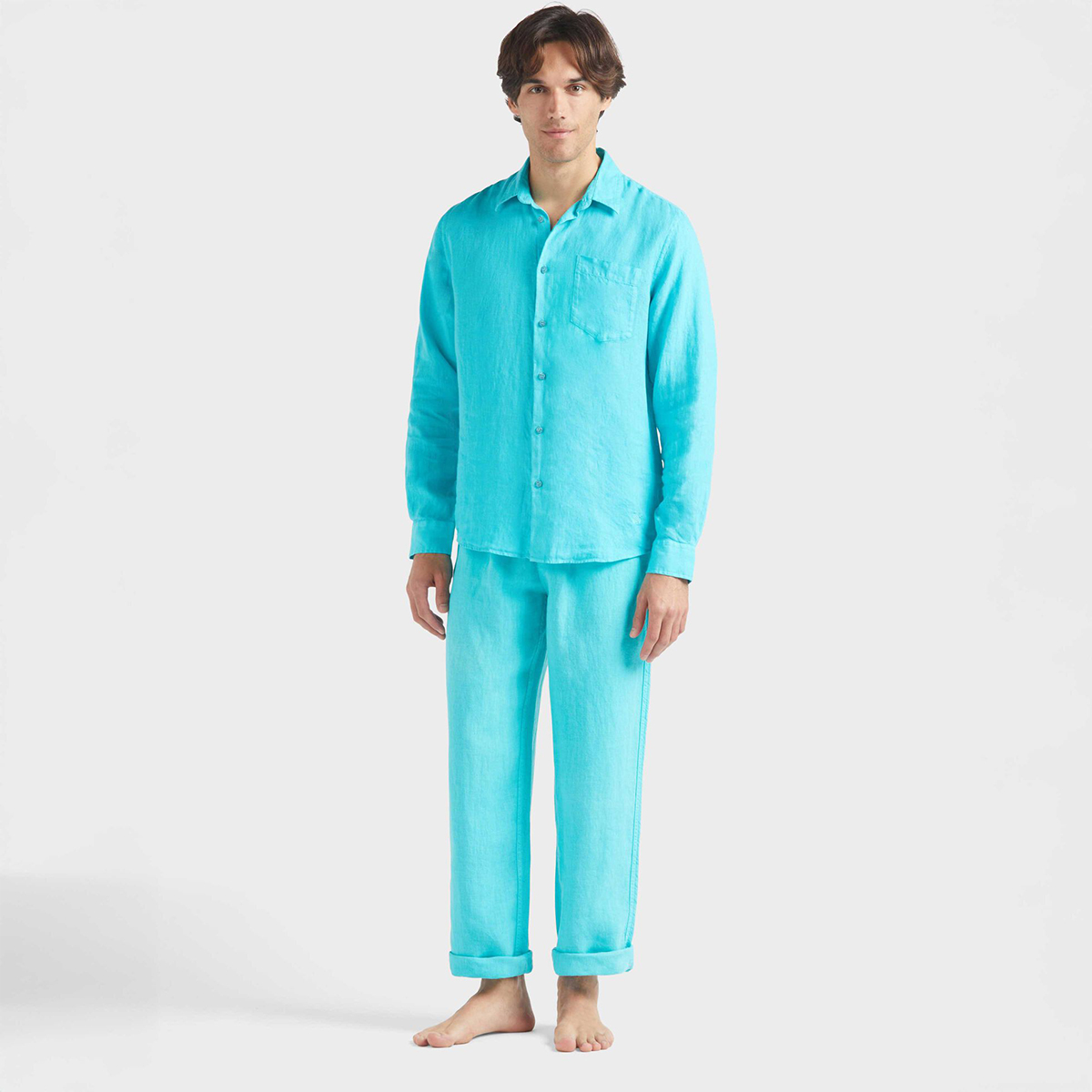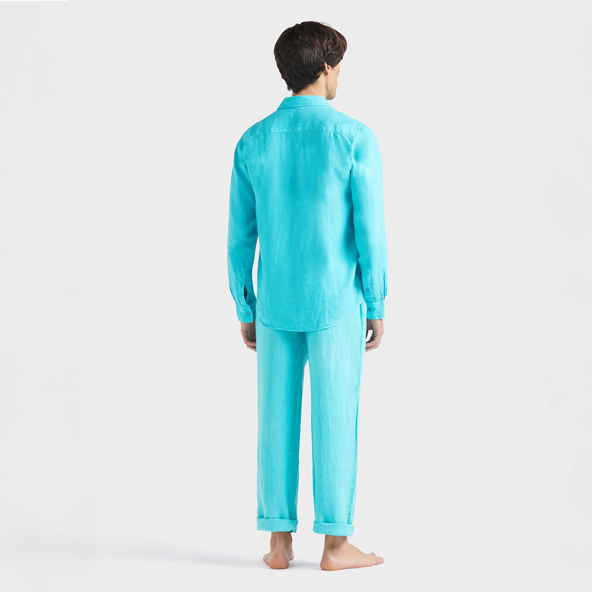 Caroubis uzun kollu keten gömlekler, Vilebrequin’in St Tropez’den ilham alan stilini klasik, sade bir kesimle gösteriyor. Yumuşak keten kumaştan yapılmış bu gömlek, eteğinde aynı tonda işlenmiş ikonik kaplumbağa logosu ile dikkat çekiyor.