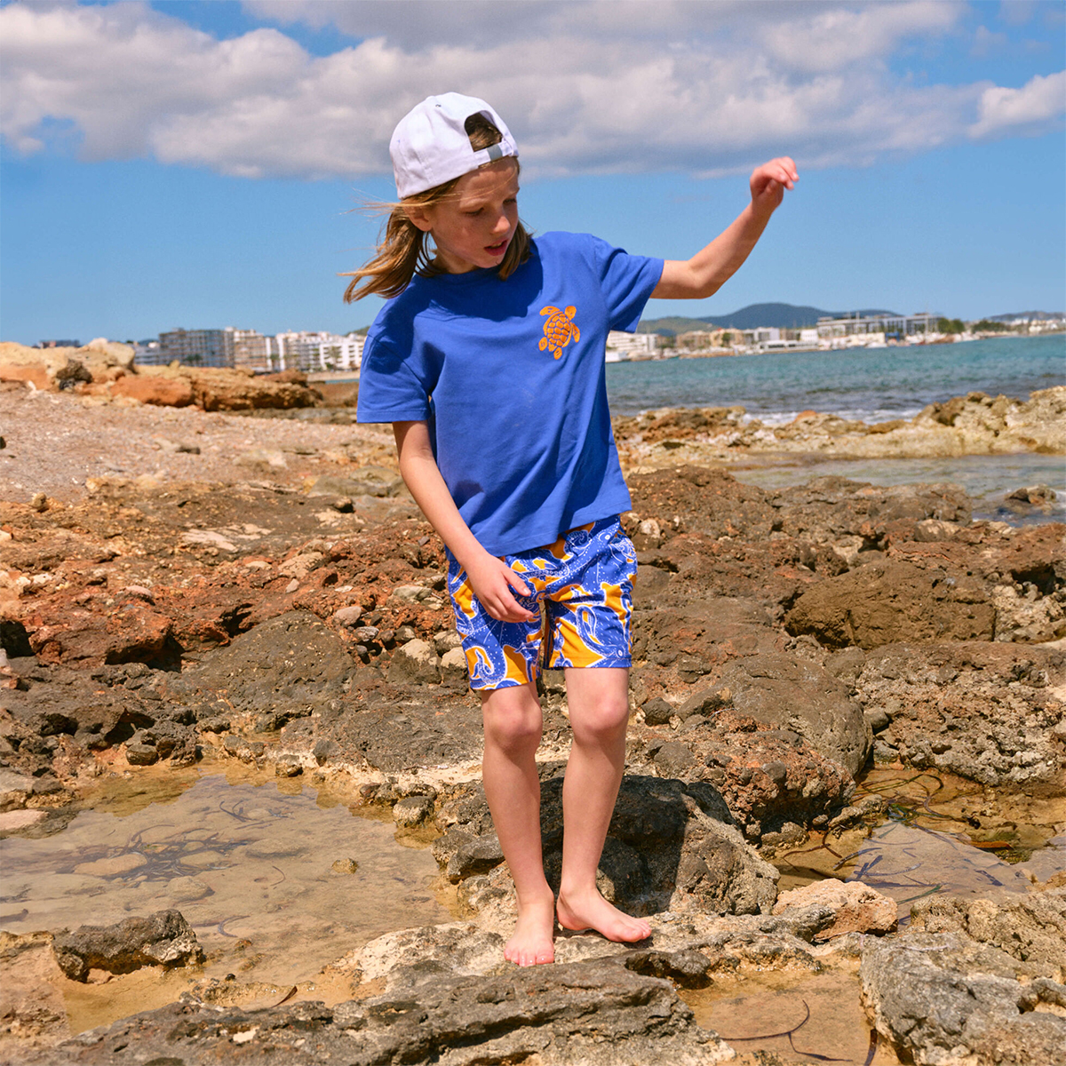 Plajda geçireceğiniz rahat günler için, rahat organik pamuklu jarseden üretilen bu çocuk tişörtünün ön kısmında göz alıcı bir baskı bulunuyor. Bu ürün koleksiyondaki şortlar ile mükemmel şekilde kombinlenebilir.