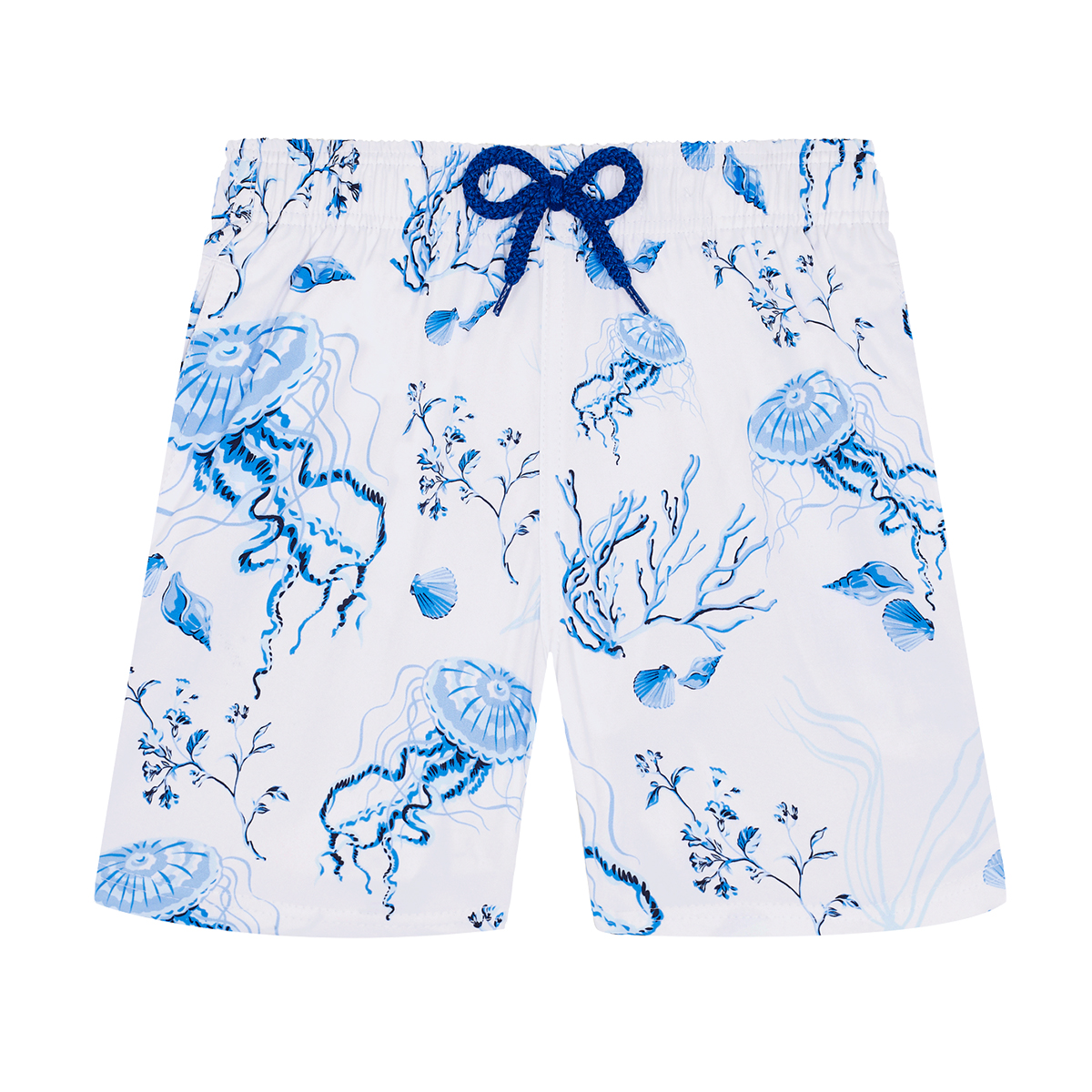 Yumuşak ve hafif Jirise erkek çocuk yüzme şortu, streç kalıbıyla Vilebrequin tasarımına yeni bir yorum getiriyor. Erkek Moorise modelinin çocuklar için uyarlanmış bu versiyonu iki yan ceplerine ek olarak sabit bir düğüme, elastik bel bandına ve arka cebe sahiptir.