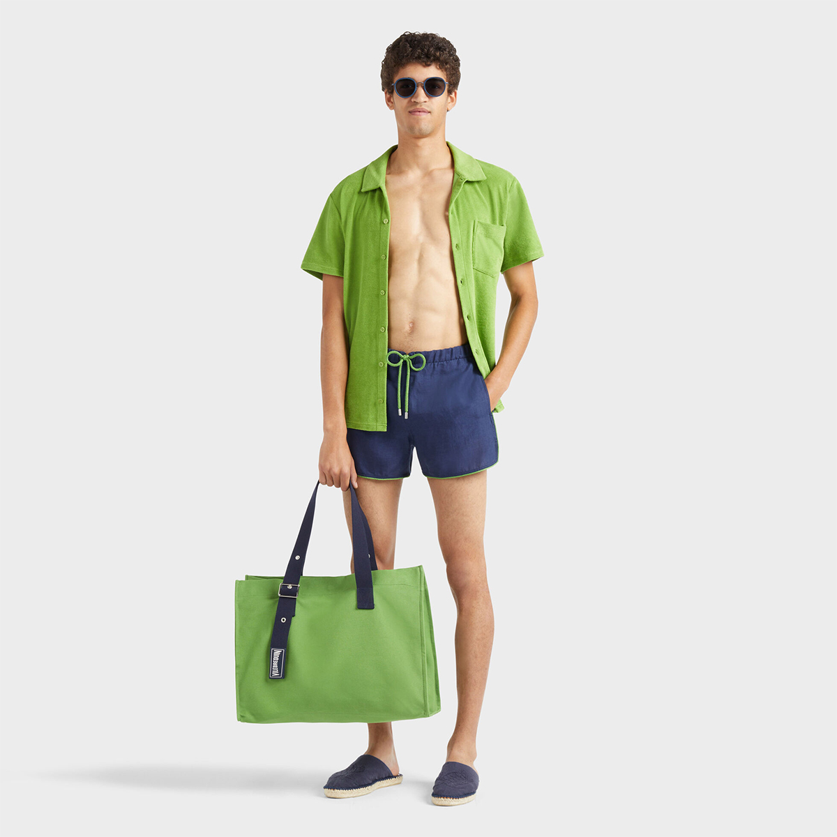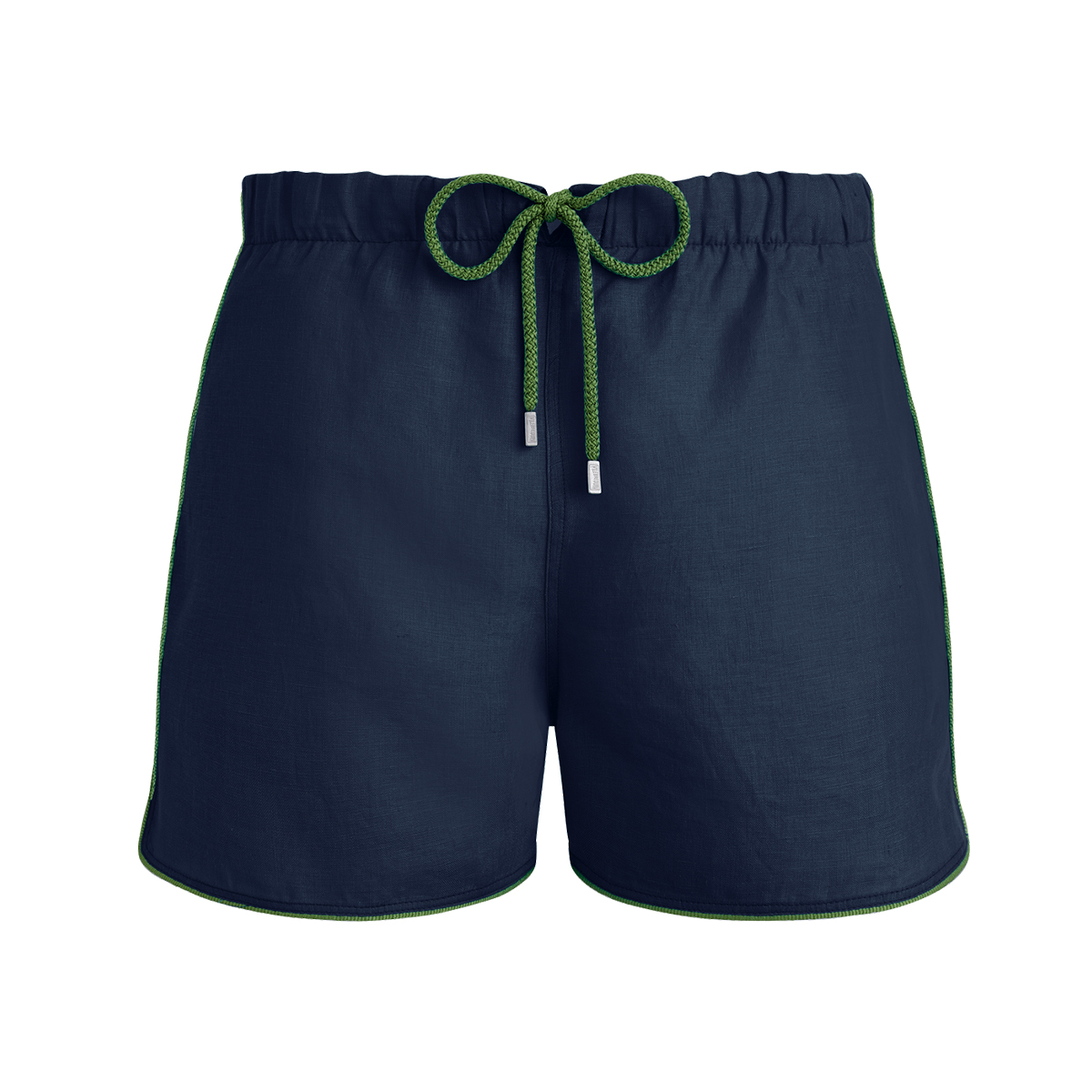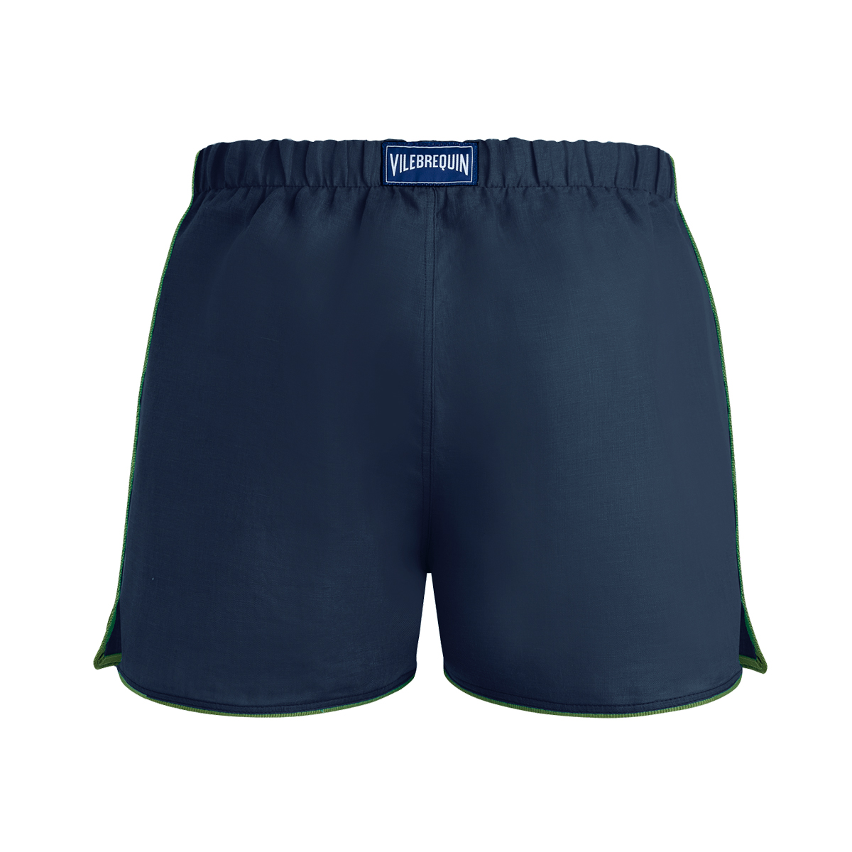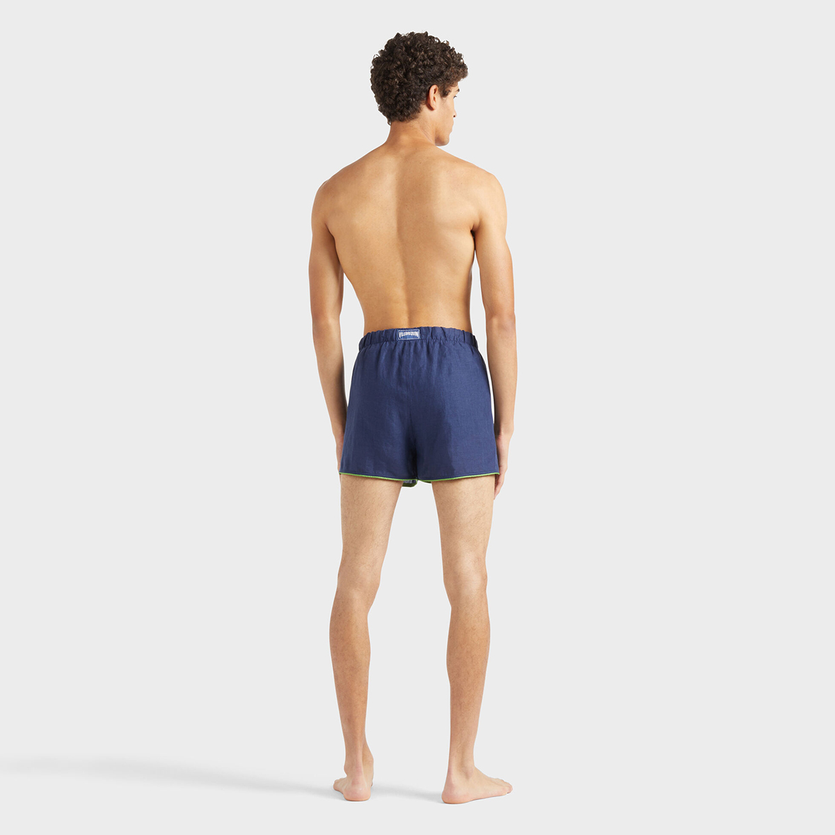 Üst düzey bir zarafet sunan bu hafif yüzme şortları, keten kumaştan üretilmiştir ve Vilebrequin logosu işlenmiş uçlara sahip bağcıklı elastik bele sahiptir. Nefes alabilen keten kumaştan üretilmiş erkek yüzme şortu; su içinde ve dışında eşsiz konfor ve stil sunar Bağcıklı elastik bel İki yan cep Suya dayanıklı file astarla tamamen astarlanmıştır (%100 polyamid) Hafif kumaş M bedende yan paça uzunluğu: 33,7 cm M bedende iç bacak boyu: 11 cm Vintage esintili tasarım Fred Prysquel’in orijinal Vilebrequin yüzme şortlarından ilham alınmıştır Model 185 cm boyunda ve M beden giymektedir Erkek yüzme şortu