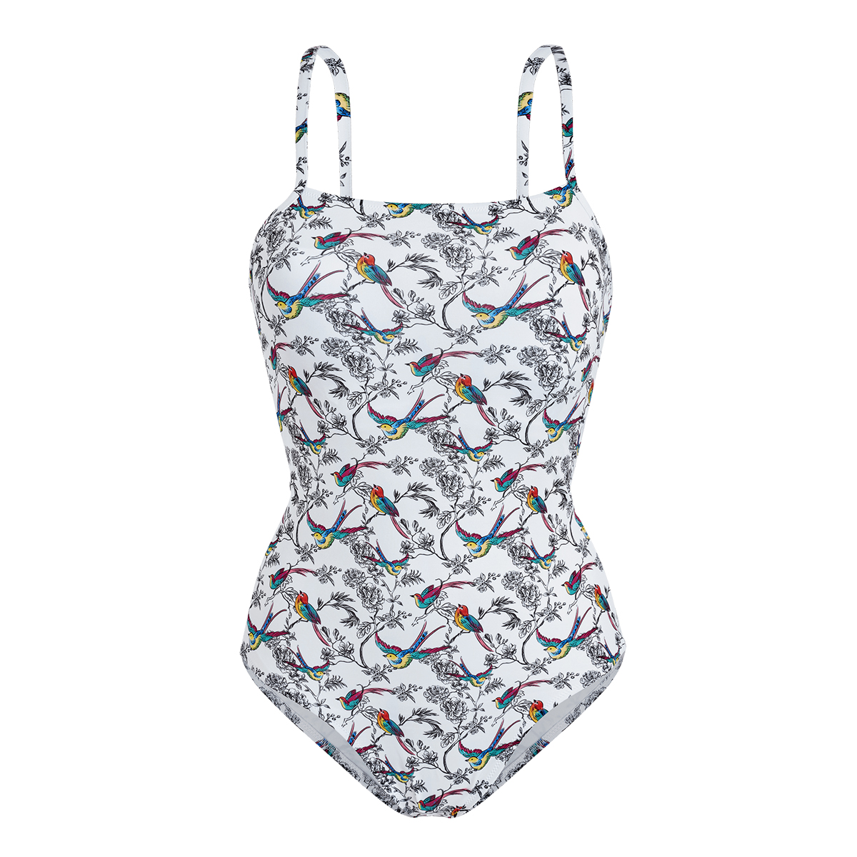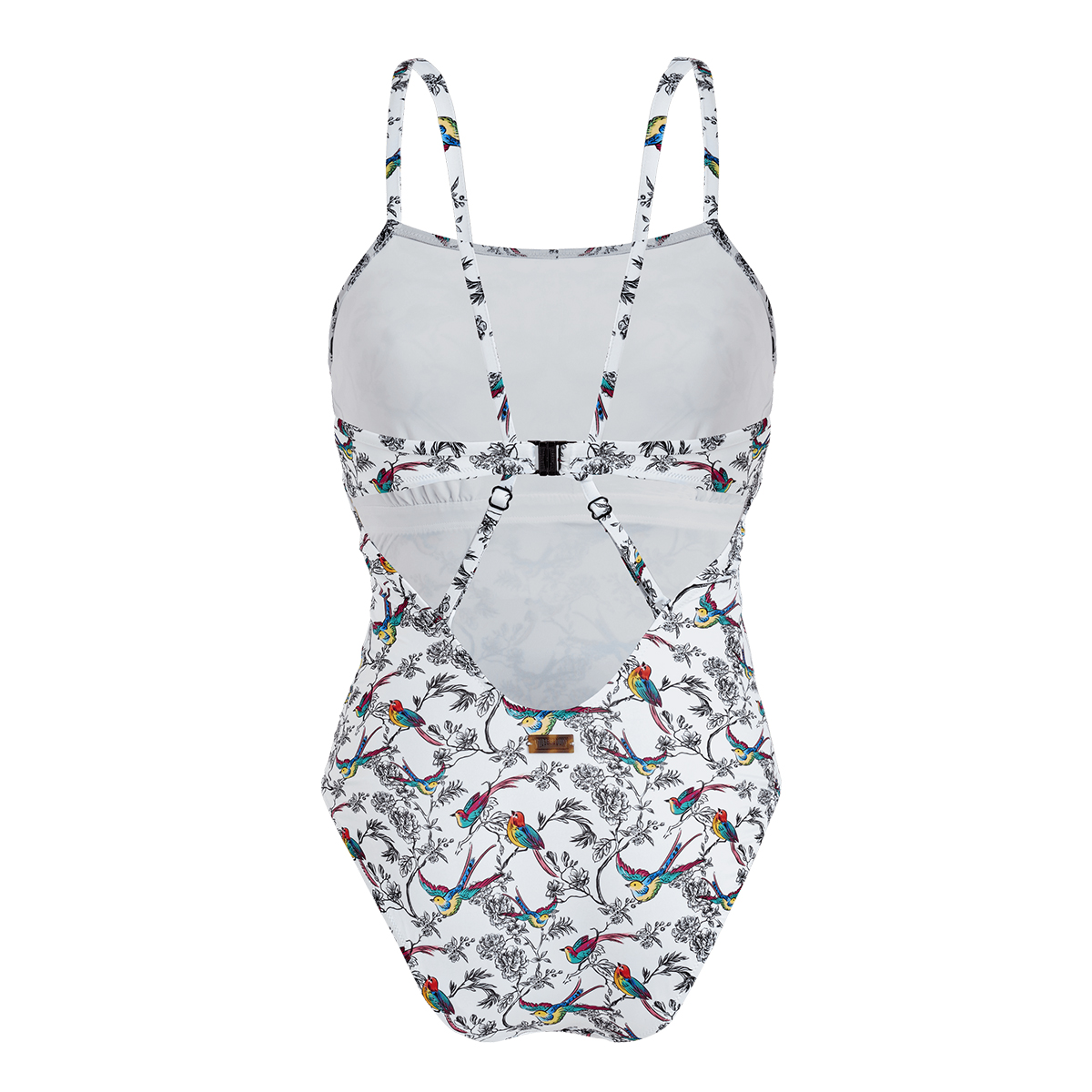 Arkası iki parça görünümünde, renkli tasarımlı, şık tek parça mayo.