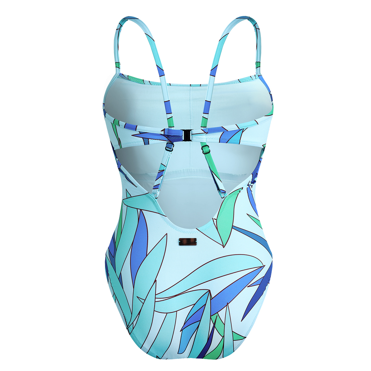 Arkası iki parça görünümünde, renkli tasarımlı, şık tek parça mayo.