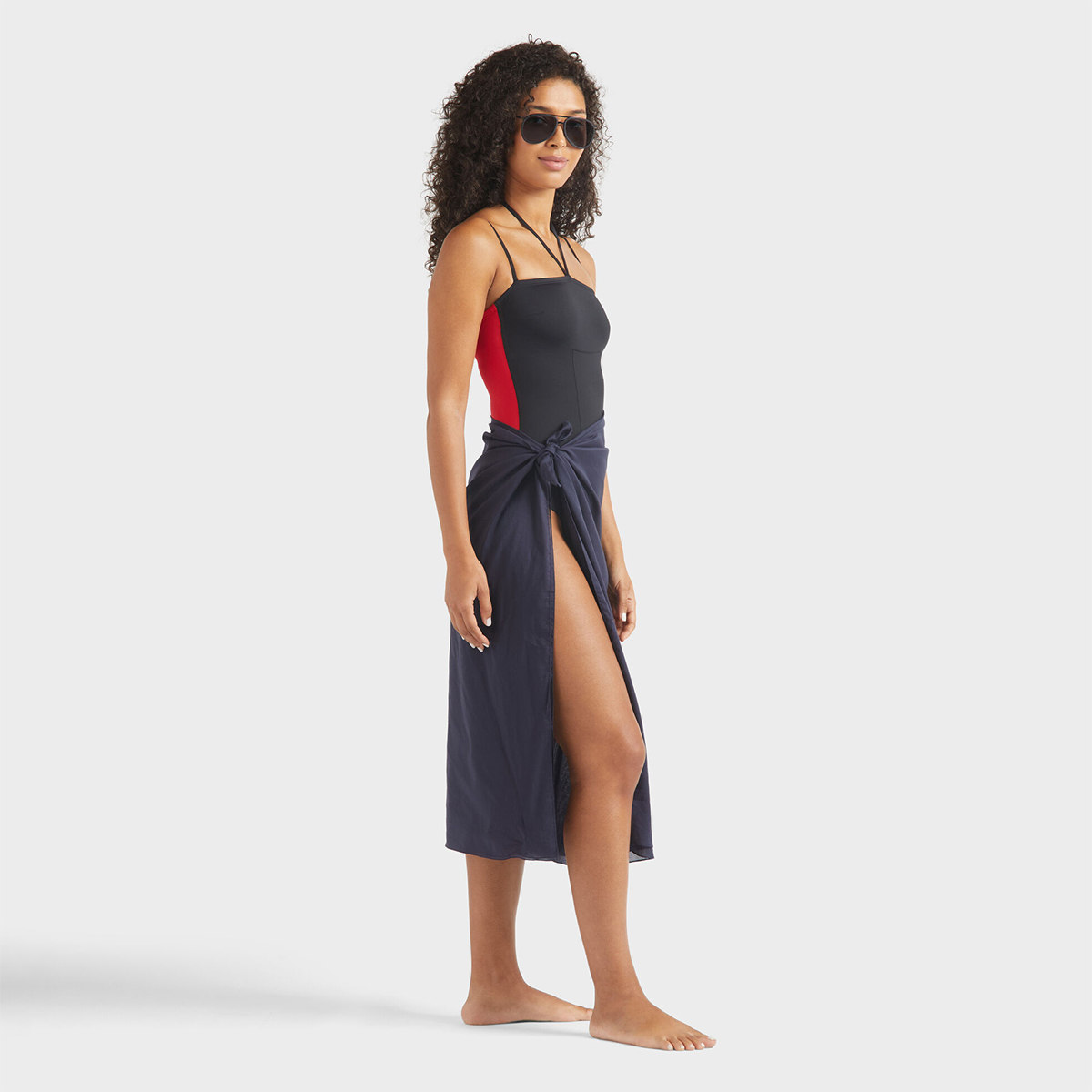 Siyah ön ve çarpıcı ruj kırmızısı arka kısmıyla sofistike bir görünüm sağlayan bu şık tek parça mayo ayarlanabilir iki renkli askıları ve Vilebrequin işlemeli uçlu askısı ile dikkat çekiyor.