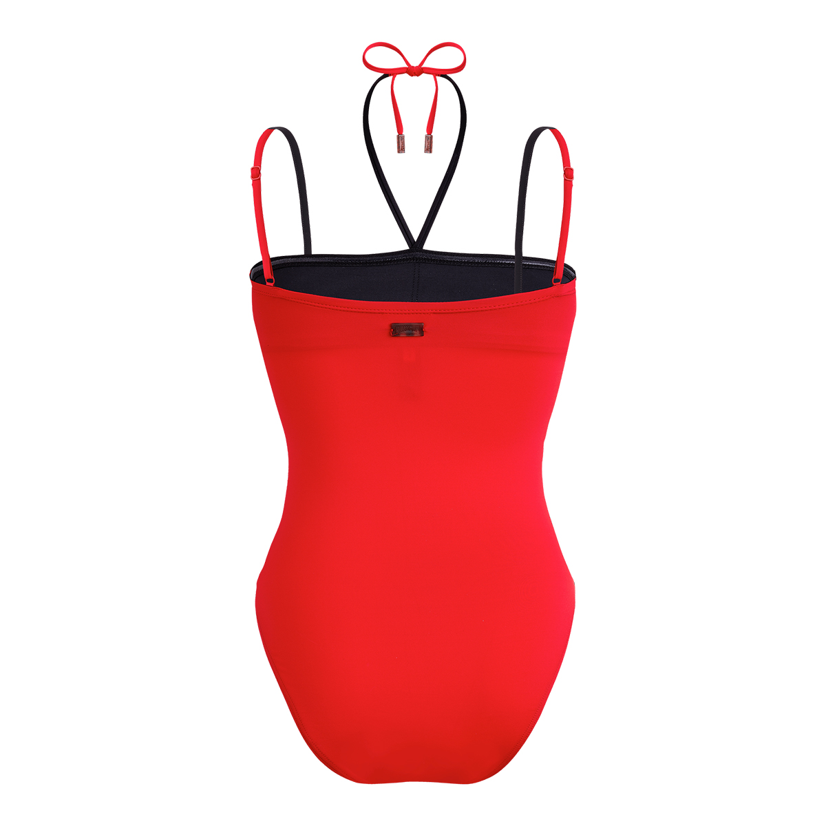 • İki renkli tek parça mayo: siyah ön ve ruj kırmızısı arka.